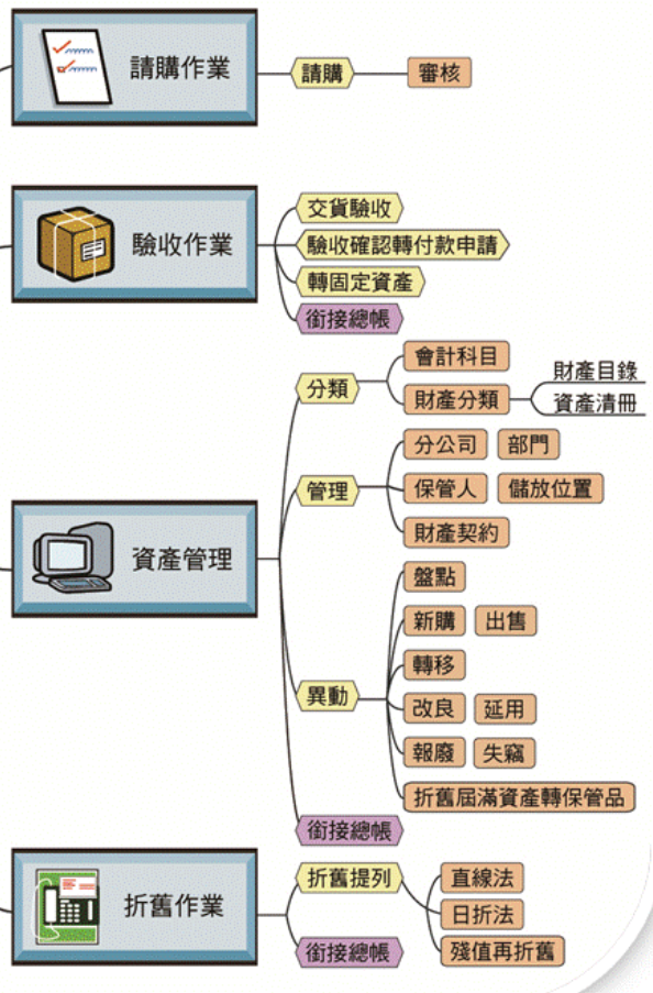 紀錄資產的取得、異動、處分、調撥、改良、保管人、使用人等。